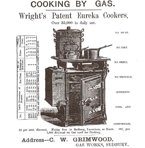By 1880 the price of gas had more than halved over a span of 40 years and the Sudbury gas company had 450 customers who paid either by putting a penny or shilling (5p) in a slot meter or had a credit meter that recorded consumption. By 1885 gas was being used for cooking and heating as well as lighting and the company was selling gas cookers. These regulated hob and oven temperatures accurately, a big step forward from the guesswork necessary when using a cast iron range heated by solid fuel. These new appliances fed the demand for gas and by the turn of the century the company had connected 580 businesses and homes to the mains, and the upward trend continued despite the availability of electricity which in 1904 replaced gas lighting in Sudbury streets.